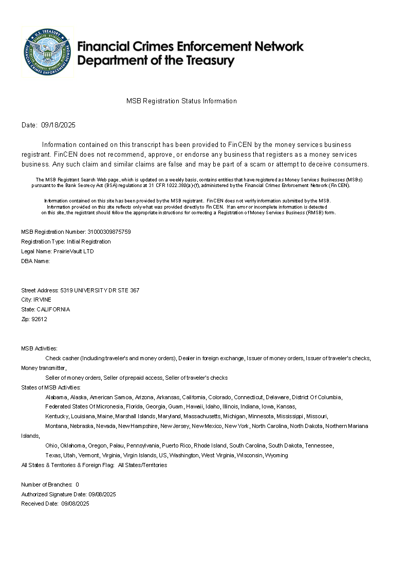 Establishing Regulatory Momentum: PrairieVault Exchange Secures U.S. MSB Registration to Bolster Global Expansion Strategy